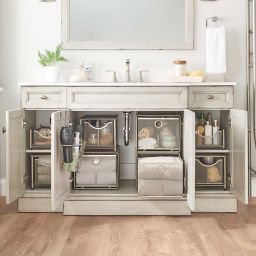 41 Bathroom Organization Ideas For Counters Cabinets And More Apartment Therapy from cdn.apartmenttherapy.info My cabinet below the bathroom sink is actually pretty spacious. Bedbathandbeyond.com) make it easy to grab mousse or hairspray on the fly. These quick and easy storage tips will help clear clutter from under the sink, on countertops, in drawers and more. I can admit that i'm guilty of this. In fact, experts advise that medicines should not be stored in the bathroom. There are a few zones i've mapped out around the vanity: The key is to create functional systems where items are contained and have. This bathroom cabinet idea isn't just for small bathrooms!